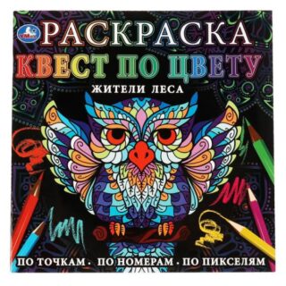 Раскраска обучающая Квест по цвету-Жители леса (по точкам,номерам,пикселям) 24*24см Умка 069102