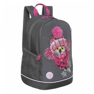 Рюкзак школьный 19л Grizzly женский Сова в шапке темно-серый, жестк.спинка 28*38*18см RG-363-10