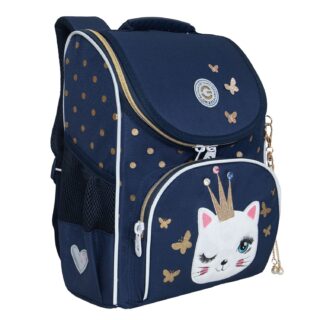 Ранец анатомическая спинка 11л Grizzly женский Кошечка в короне синий 25*33*13см (+мешок) RAm-484-3