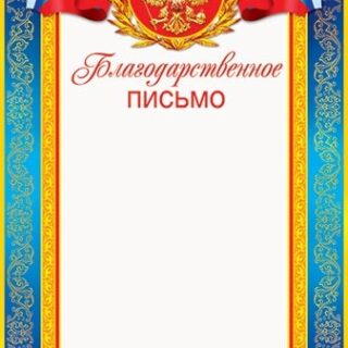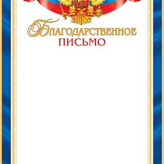 Благодарственное письмо для принтера А4 Герб, флаг РФ, синяя рамка 9-19-349
