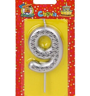 Свеча Цифра (9) Серебро глиттер малая на блистере Дон карнавал С-1837