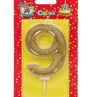 Свеча Цифра (9) Золотой глиттер малая на блистере Дон карнавал С-1827
