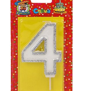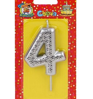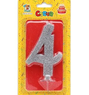 Свеча Цифра (4) Серебро глиттер малая на блистере Дон карнавал С-1832