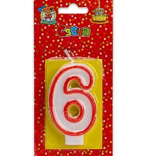 Свеча Цифра (6) Белая с блестками и с красной окантовкой на блистере Дон карнавал С-2411
