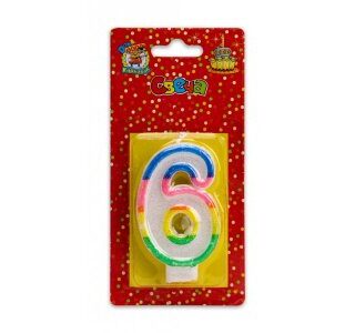 Свеча Цифра (6) Блеск с разноцветной окантовкой на блистере 7*4см С-2421