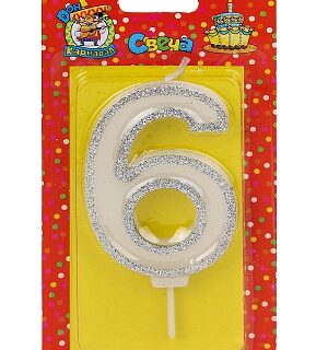Свеча Цифра (6) Белая с серебряной окантовкой из глиттера на блистере Дон карнавал С-5960