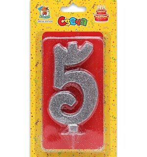 Свеча Цифра (5) Серебро глиттер малая на блистере Дон карнавал С-1833