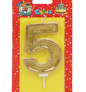 Свеча Цифра (5) Золотой глиттер малая на блистере Дон карнавал С-1823