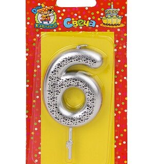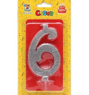 Свеча Цифра (6) Серебро глиттер малая на блистере Дон карнавал С-1834