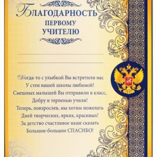 Благодарность Первому учителю А4 символика РФ и надпись 01.684.00