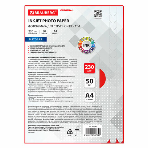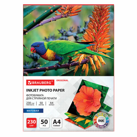 Бумага для ФОТОПЕЧАТИ А4 230гр 50л матовая односторонняя Brauberg Original 363991 для струйн.принт
