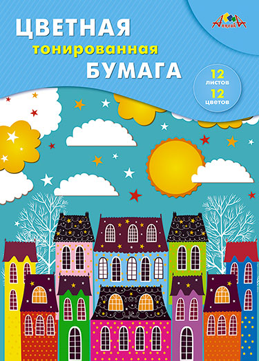 Цветная тонированная бумага, 12 листов, 12 цветов. Формат А4. Внутренний блок -тонированная бумага – бумага прокрашенная в массе при изготовлении, плотность 80 г/м2.