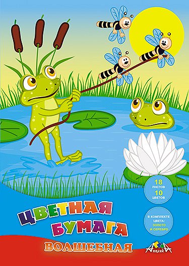 Цветная бумага Волшебная 18 листов, 10 цветов. Формат А4. Внутренний блок – офсет №2, 50 г/м2, двойной прокрас с одной стороны + 2 листа мелованной бумаги.