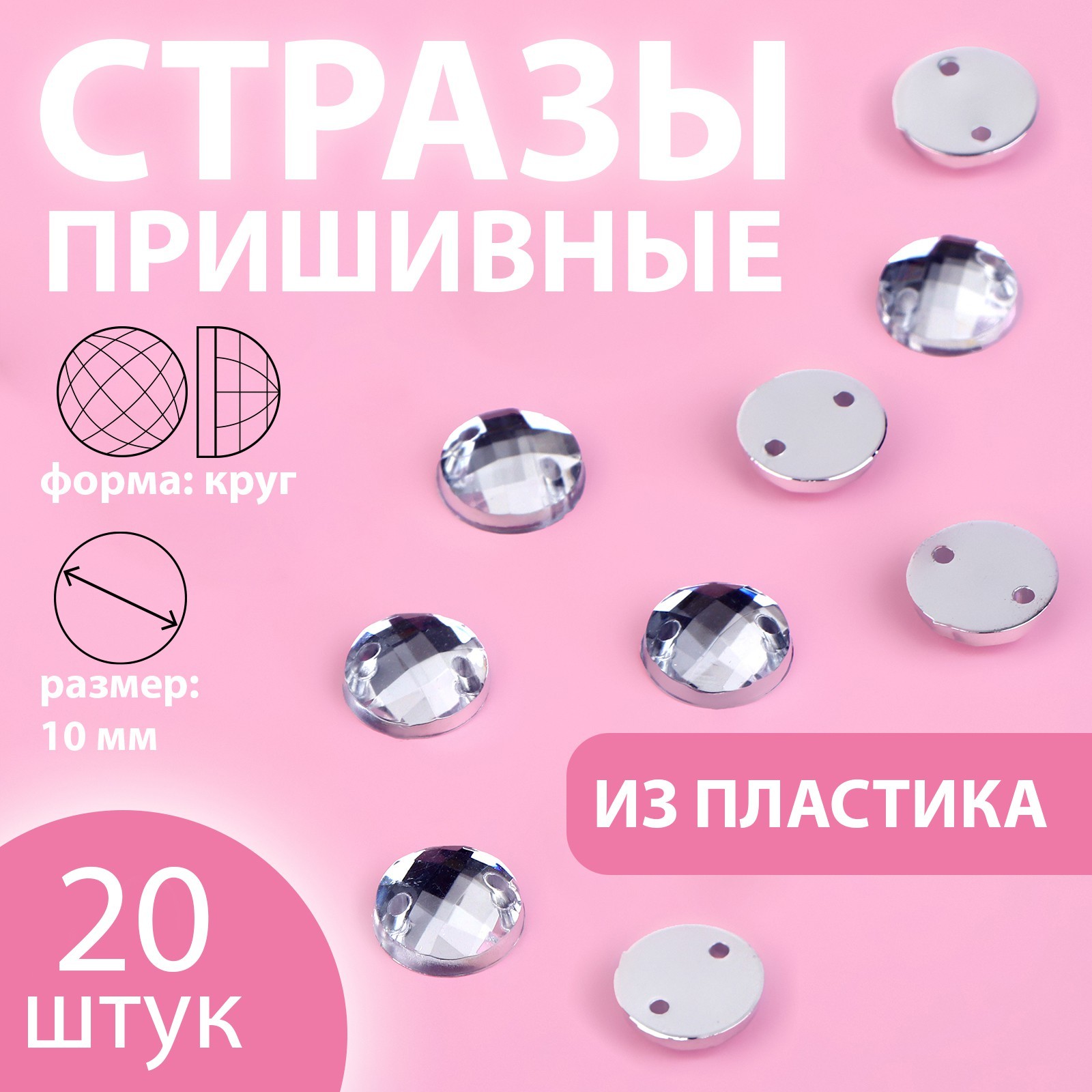 Декор для творчества Стразы пришивные Круглые 10 мм блестящие (набор 20шт) 9868464 quantity