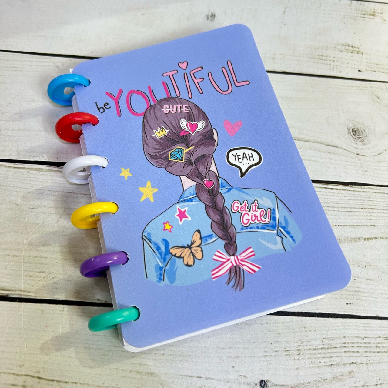 Записная книжка А6 80л пласт.обл. Девушки M-9248 цветные кольца-сердечки, клетка, 4 дизайна