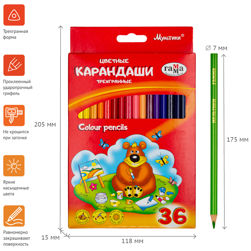 Карандаши цветные 36цв. Гамма Мультики 050918_10 трехгранные (мягкий грифель 2,9 мм) дерево
