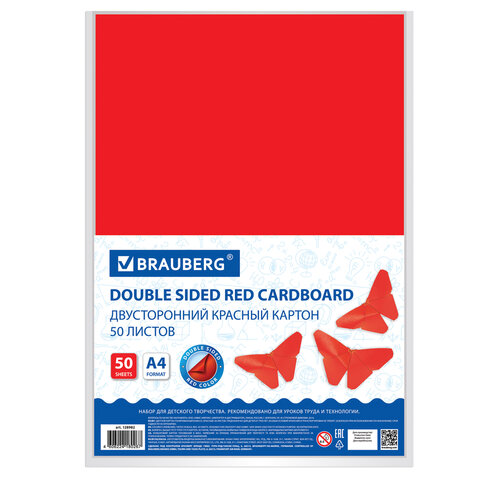 Картон цветной одноцветный двухсторонний А4 50л Красный (220гр) тонированный в пакетеBrauberg 128982