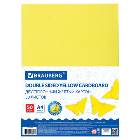 Картон цветной одноцветный двухсторонний А4 50л Желтый (220гр) тонированный в пакете Brauberg 128985