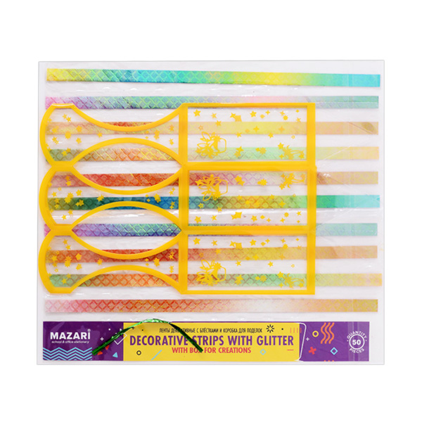 Лента для декора 10мм*25см бумажная 50 штук с блестками + коробочка для поделок Mazari M-4465