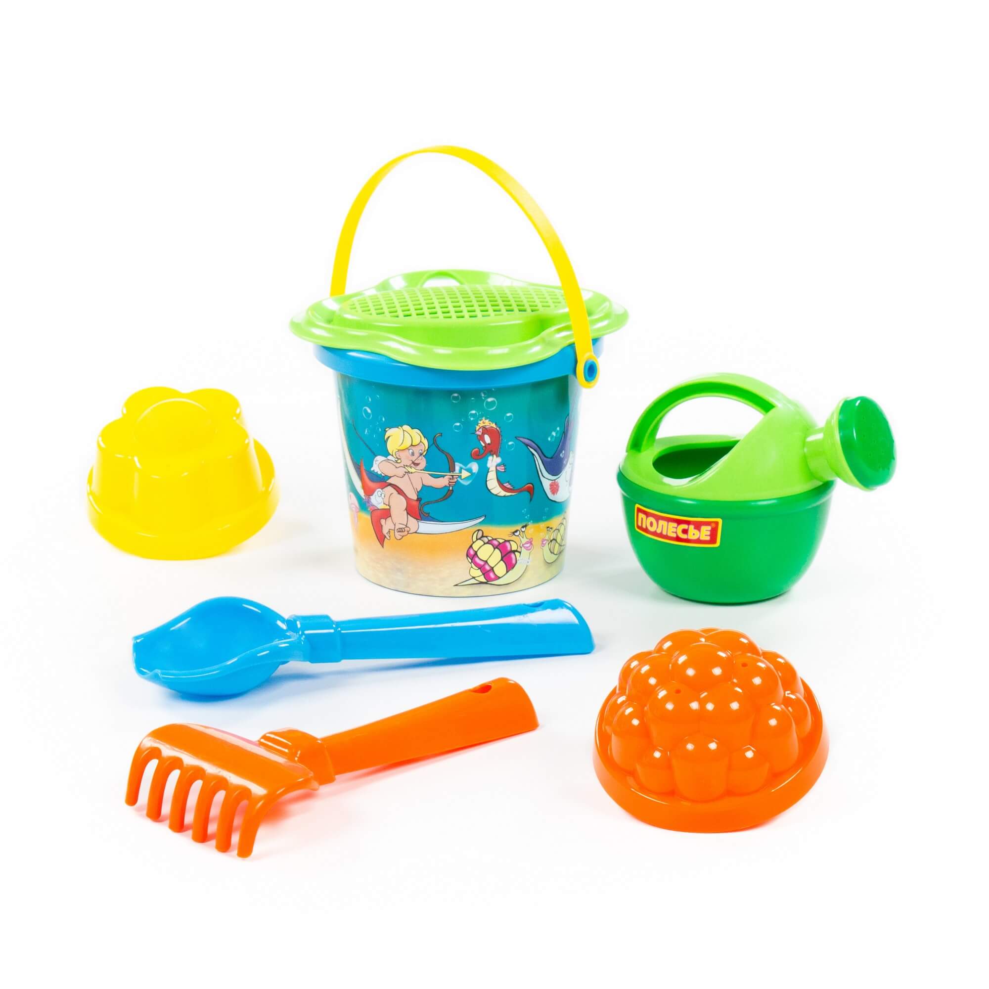 Набор песочный №228 (ведро малое с накл., лейка, лопатка, грабли, сито, 2форм.) Полесье в сетке 0559