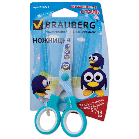 Ножницы детские 130мм с принтом на лезвиях Пингвины, цвет голубой Brauberg 232271