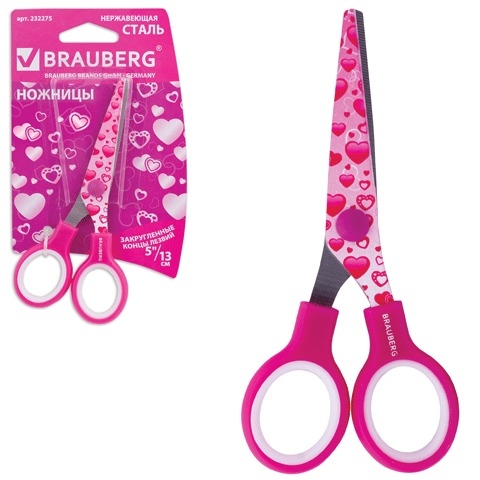 Ножницы детские 130мм с принтом на лезвиях Сердечки, цвет малиновый Brauberg 232275 блистер