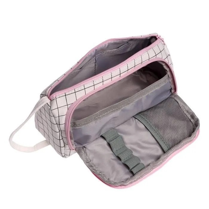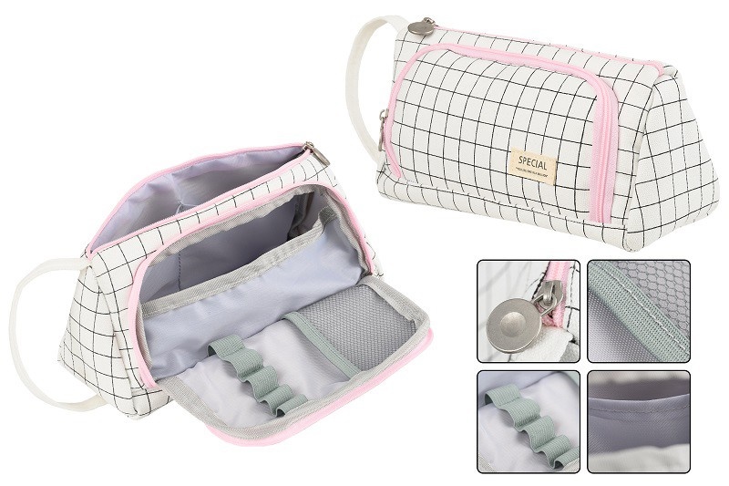 Пенал-косметичка сумочкой ткань 2 отдела, откидной карман, Клетка (белый) 11201 розовые молнии