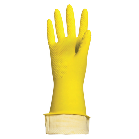 Они изготовлены из прочного латексного материала, что гарантирует защиту рук от механических внешних повреждений. Классический размер S подойдет на руку небольшого размера. В комплекте – 1 пара. Внутреннее хлопчатобумажное напыление обеспечивает гипоаллергенность и гигроскопичность. Рельефная поверхность препятствует скольжению предметов. Тип манжеты: закатанный край. Нельзя использовать при работе с растворителями и электрическим током. Данные перчатки можно использовать несколько раз. Цвет – желтый.