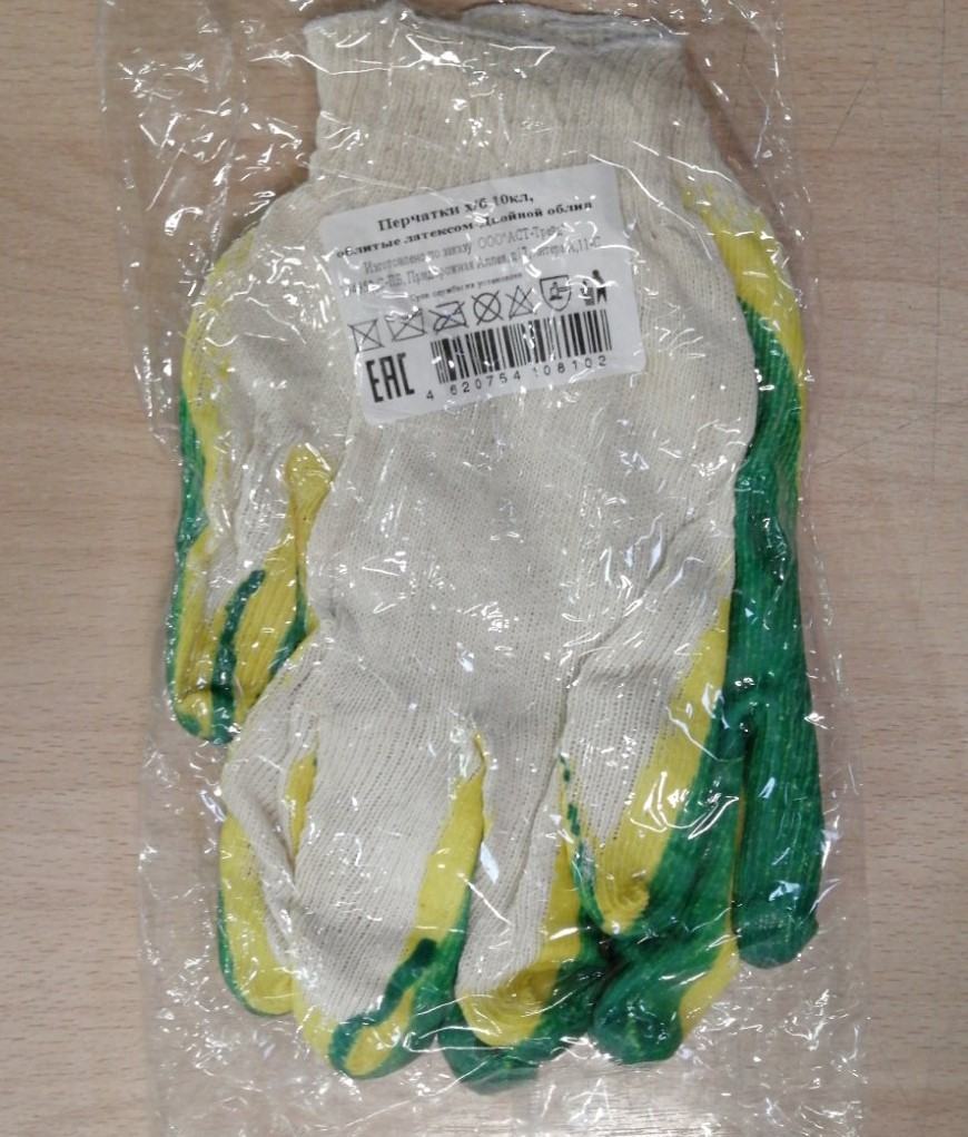 Перчатки х/б латексный Двойной облив (зелен+желт облив) в индивидуальной упаковке
