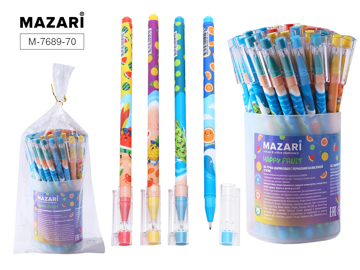 Ручка шар. Mazari Happy fruit синяя 0,7мм M-7689 масляная, цветной корпус, яркие фрукты 4 вида