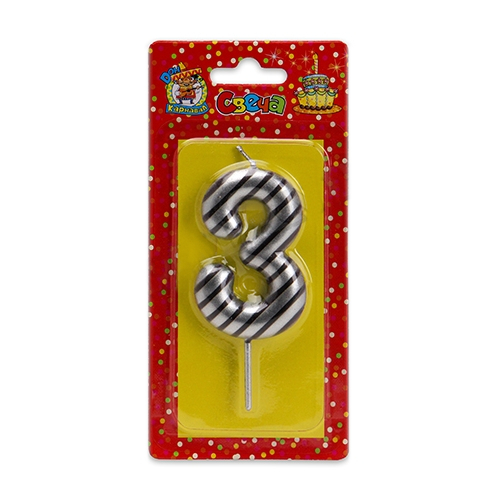 Свеча Цифра (3) Серебро в черную полоску на блистере Дон Карнавал С-2522