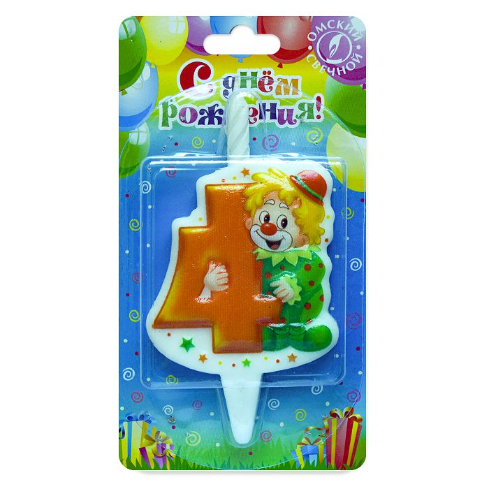 Свеча Цифра (4) С Днем рождения! клоун, на блистере 2984