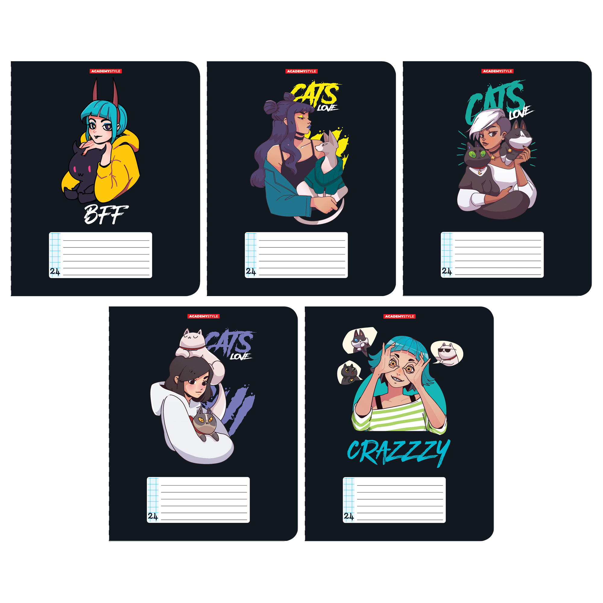 Тетрадь 24л клетка цвет/обложка Девушки с питомцами (5 видов) ВД-лак Академия 14349/5 белизна 100%